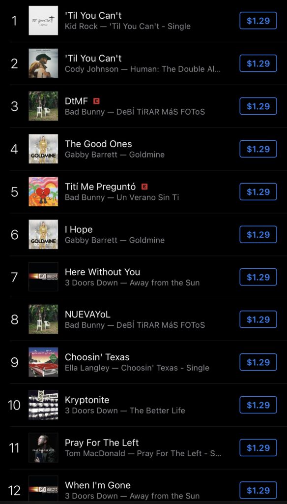 By the afternoon of February 9, the iTunes charts showed a dominant surge for the TPUSA performers. Kid Rock’s version was closely followed by the original rendition of the song by country singer Cody Johnson. These two tracks successfully pushed Bad Bunny’s lead single, "DtMF," down to third place.